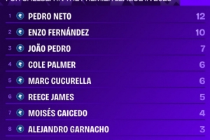 2025年切尔西队内英超参与进球榜: