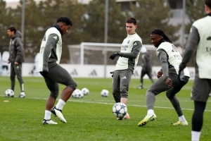 体育资讯11月24日讯 北京时间11月27日凌晨4:00,欧冠联赛阶段第5轮,皇马将客战奥林匹亚科斯。今日皇马官方晒出球队训练图,马斯坦托诺参加部分合练。
